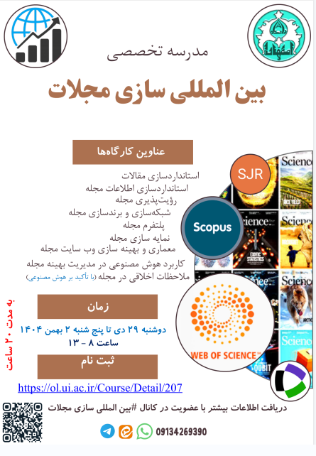 مدرسه جامع تکنیک‌ها و تاکتیک‌های بین‌المللی‌سازی و ارتقای رتبه دانشگاه با عنوان "بین المللی سازی مجلات" توسط دانشگاه اصفهان  از 29 دی ماه تا 2 بهمن ماه 1404 به صورت مجازی و با آدرس https://ol.ui.ac.ir/Course/Detail/207 برگزار خواهد شد.