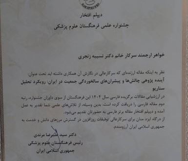 در بخش جایزه مقاله برتر فارسی از دکتر نسیبه زنجری و دکتر احمد دلبری به همراه سایر همکاران در نگارش مقاله "آینده پژوهی چالش ها و پیشران های سالخوردگی جمعیت در ایران: رویکرد تحلیل سناریو" چاپ شده در "مجله سالمندی ایران" در سال 1403 به عنوان رتبه دوم با اهداء دیپلم افتخار و لوح سپاس تجلیل و قدردانی شد.